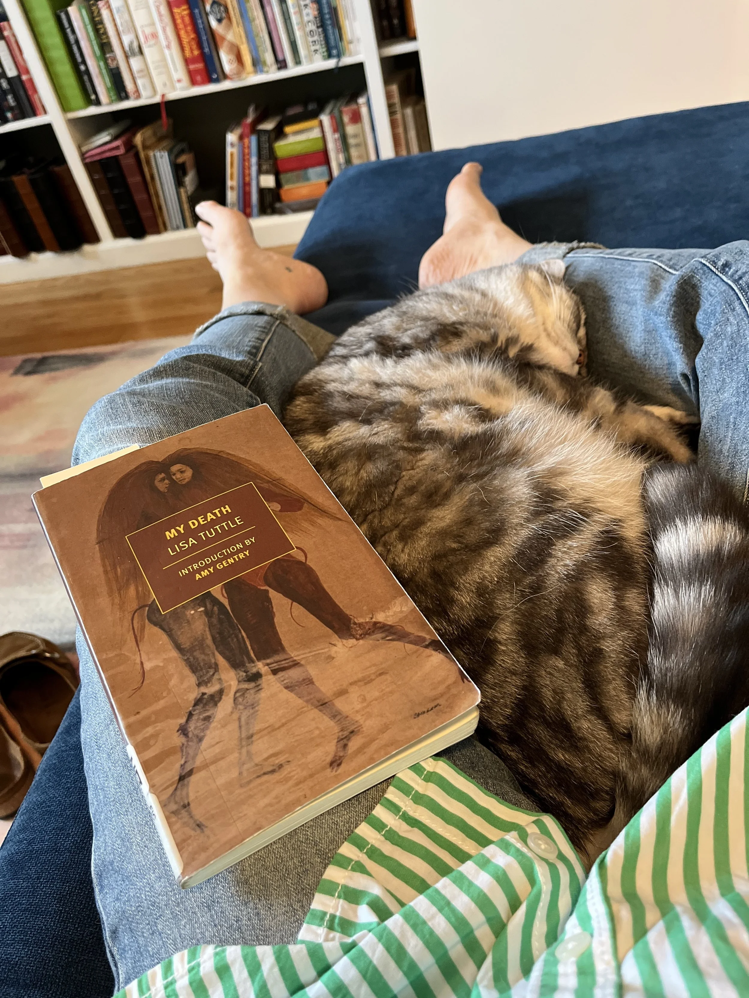 My typical reading place and position. Lisa Tuttle’s novella “My Death” was the first read of 2026.